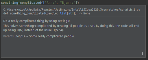 I dette tilfellet bruker jeg Python som et eksempel, men det finnes også verktøy til andre språk. Man kan også bestemme seg for å ikke skrive dokumentasjonen på et like granulært nivå som blir vist frem her.