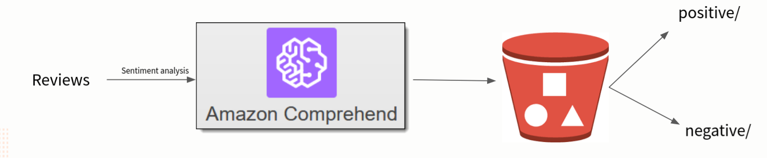Comprehend kan som nevnt utføre sentimentanalyse, hvor du får klassifisert tekst som positivt eller negativt ladet, i tillegg til tilliten (confidence) knyttet til klassifiseringen. Disse kan plasseres i forskjellige mapper i en S3-bøtte basert på klassifiseringen, eller sendes andre steder for videre prosessering eller lagring. For å orkestrere dette kan du bruke AWS Lambda.