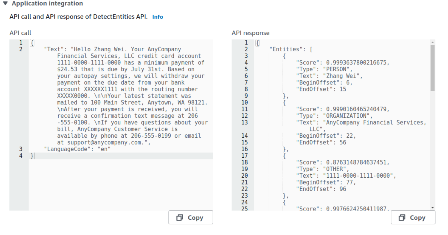 Er du mer interessert i å analysere tekster, er AWS Comprehend-tjenesten for deg. I Comprehend sender du inn tekst og får tilbake informasjon om teksten på et mye mer kompakt format. Comprehend kan identifisere entiteter (som f. eks navn, adresser, firmaer), nøkkelord, tema, tekstens sentiment (positivt eller negativt ladet tekst) og mer. Det kreves lite av forståelse av hvordan Comprehend funker bak kulissene for å ta det i bruk. Også her er det kun et API-kall med tilhørende tekst som skal til for å få tilbake nyttig informasjon.