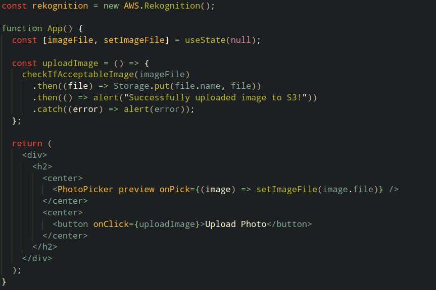 Det er i funksjonen checkIfAcceptableImage(imageFile) at Rekognition kommer inn i bildet. Den funksjonen skal vi ta en nærmere titt på nå.