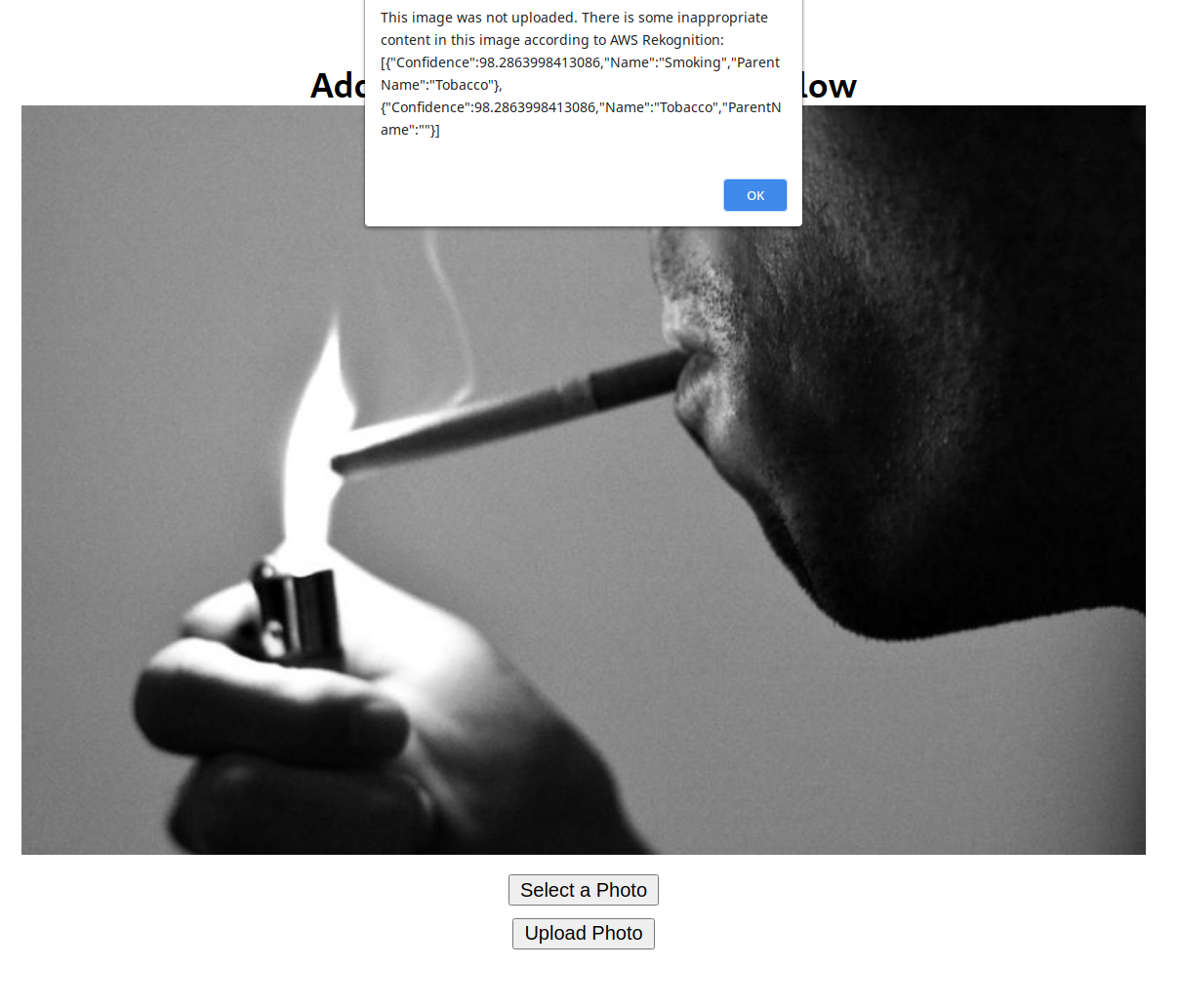 Ettersom Rekognitions SDK sender API-kall over nettet returnerer funksjonen et promise-objekt. Kallet til detectModerationLabels er stedet all magien skjer! Vi slenger inn parameterne, som inneholder bildet og en callback-funksjon. Det er i callback-funksjonen vi definerer hva vi syns er passende bilder basert på moderationLabels i responsen fra Rekognition. For å gjøre det enkelt denne gangen, så sier vi at bildet kun er akseptabelt om det ikke inneholder noen moderationLabels. Nå har vi alt vi trenger for en fungerende Web App, så la oss se på resultatet: