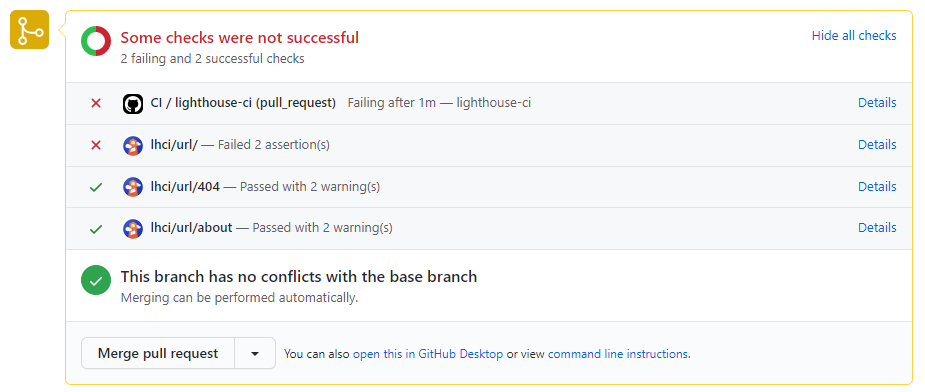Til slutt, hvis du ikke ønsker å klikke deg inn på kjøringen til workflow consolen i pull requesten for å sjekke detaljer, så kan du installere Lighthouse CI GitHub app som setter statuser synlig i pull requesten. Her er et eksempel på hvordan det ser ut for hver URL som er skannet: