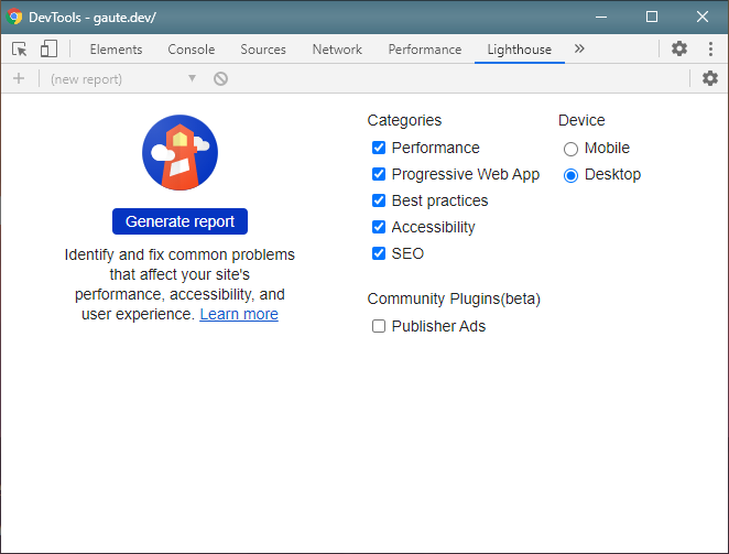 Du kan også kjøre Lighthouse i Chrome DevTools: Sørg for å ha installert Chrome, åpne en nettside, trykk F12 og naviger deg til Lighthouse-fanen. Her kan du velge hvilke kategorier som skal sjekkes og hvilken enhet kjøringen skal simuleres på. Deretter kan du trykke på “Generate report”-knappen for å få en fullstendig rapport. Dette er et enkelt tiltak for å sørge for god kvalitet på nettsiden mens du utvikler på lokal maskin.