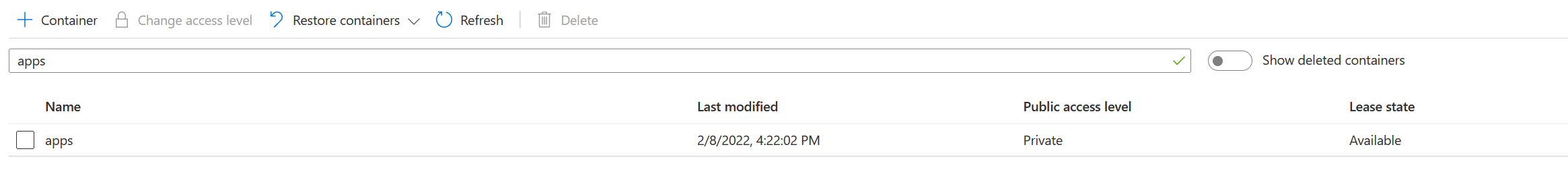 Her ser vi vår container på Azure Storage, klar til bruk: