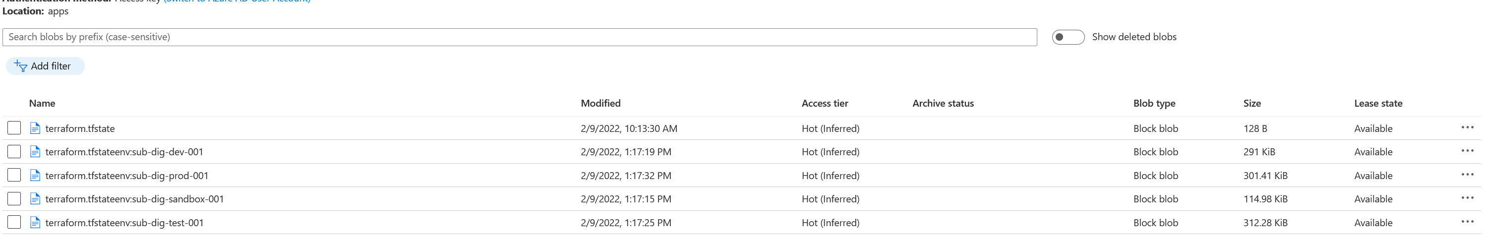 Når Terraform har kjørt ferdig vil migrasjonen være ferdig. Om du sjekker din container på Azure Storage vil du se at alle tfstate-filene, for alle workspaces er overført: