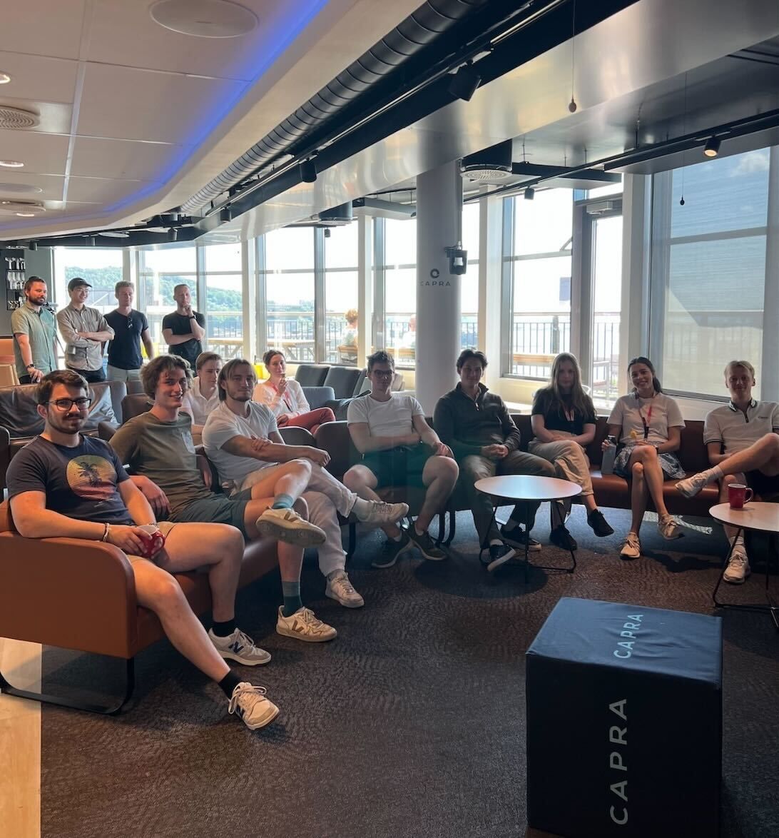 Vi følte at vi var en del av selskapet fra første dag. Vi ble lagt til i Capra sin Slack og invitert på interne arrangementer slik som fagsirkler, kurs og sosiale samlinger. Én av sommerstudentene dro til og med på Capra sitt julebord. Vi fikk også god oppfølgning av supportteamet fram mot sommeren. Gjennom HR-samtaler ble vi plassert på team basert på kompetanse og egne ønsker for faglig utvikling. Capraskolen gjorde at vi ble godt kjent med teamet vi skulle jobbe med i sommer, de andre sommerstudentene og flere som jobber i Capra lenge før oppstart. Dette førte til høy psykologisk trygghet i teamene og at vi var produktive allerede fra første arbeidsdag.
