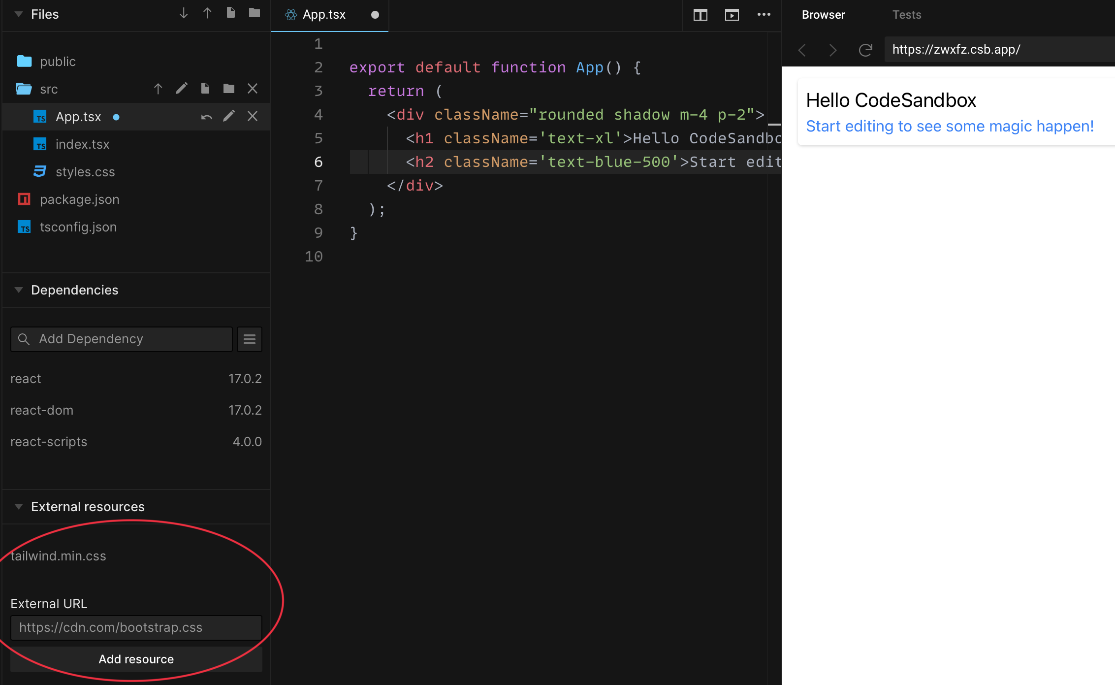 Lenken finner du nederst i installasjonsguiden til tailwind under “Using Tailwind via CDN”: https://tailwindcss.com/docs/installation. I Codesandbox går du inn på et prosjekt og finner «External resources». Klikk utvid og legg inn lenken fra tailwind (kun adressen, uten HTML-tags etc.) og trykk på «Add resource». Du kan nå ta i bruk tailwind!
