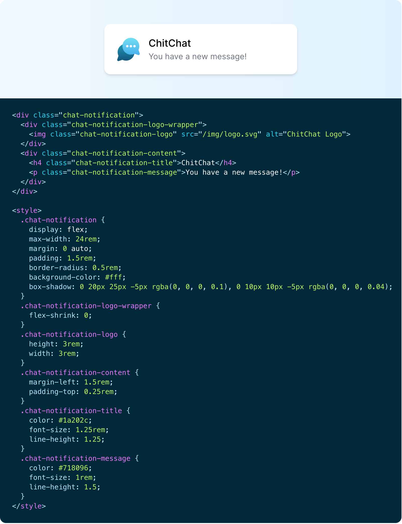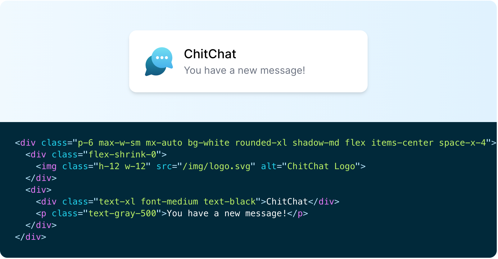 Under følger et eksempel jeg har lånt fra deres egen dokumentasjon. Det første bildet viser en tradisjonell tankegang, mens det andre viser hvordan man kan oppnå det samme med tailwind. Legg spesielt merke til at du med tailwind unngår behovet for å navngi og koble alle de forskjellige nivåene i grensesnittet. Både i koden og mentalt naturligvis. Dette er det jeg mener med lenking frem og tilbake.
