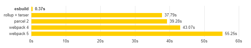 Sammenligning av esbuild og andre bundlere på tidsbruket av å bundle biblioteket three.js 10 ganger.