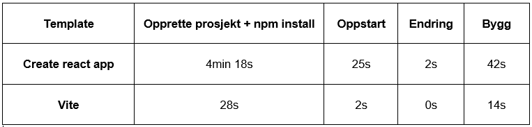 For å gi noen tall, så har jeg tatt RealWorld example app og implementert React-løsningen først med CRA (som benytter webpack) og deretter Vite. Merk at dette kun er tider på min maskin, men det gir en tydelig indikasjon.